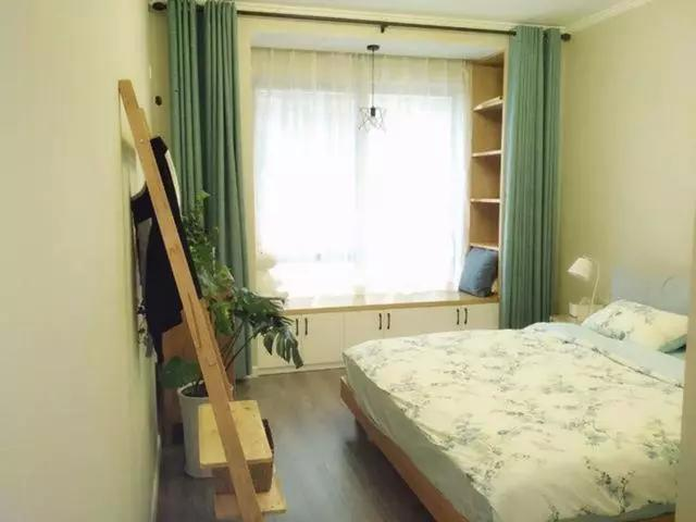 (3)墻面選擇淺藍(lán)色壁紙,搭配天藍(lán)色亞麻窗簾,冷色調(diào)與溫暖的面料材質(zhì)碰撞,讓臥室在保暖的同時(shí)安靜自然。