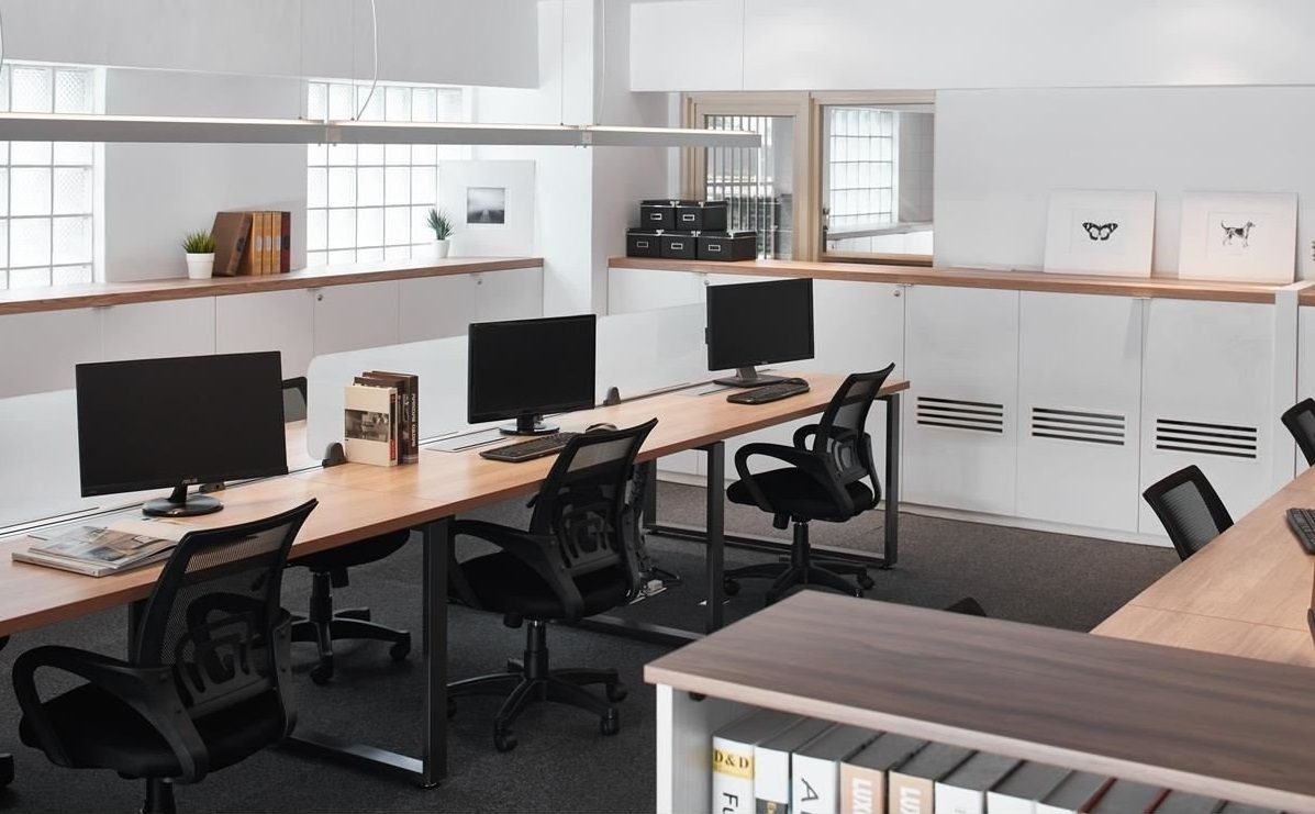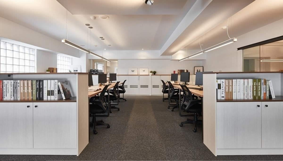 公共范圍呈開放型態(tài),將門面改為大面積清玻窗面,搭配烤漆鐵件框構(gòu),飾以弧線語匯增添線條變化,并引入明亮的自然光線,不僅讓空間感、視線無限延展,更緩解二樓辦公區(qū)采光不足的窘?jīng)r;一樓接待區(qū)采以一桌四椅軟裝布置,配置吧臺矮墻,把茶水設(shè)備與會議桌巧妙擋住,使空間少了商辦的冰冷氣息,多了居家的美好溫度;二樓辦公區(qū)在拆解隔墻后,以清玻重構(gòu)主管室、財務(wù)室隔間,使員工辦公區(qū)與兩間辦公間可共享采光,而二樓原先被擋住的窗面,則透過較低的柜體鋪排重現(xiàn)曙光,打造清爽明媚的辦公氛圍。