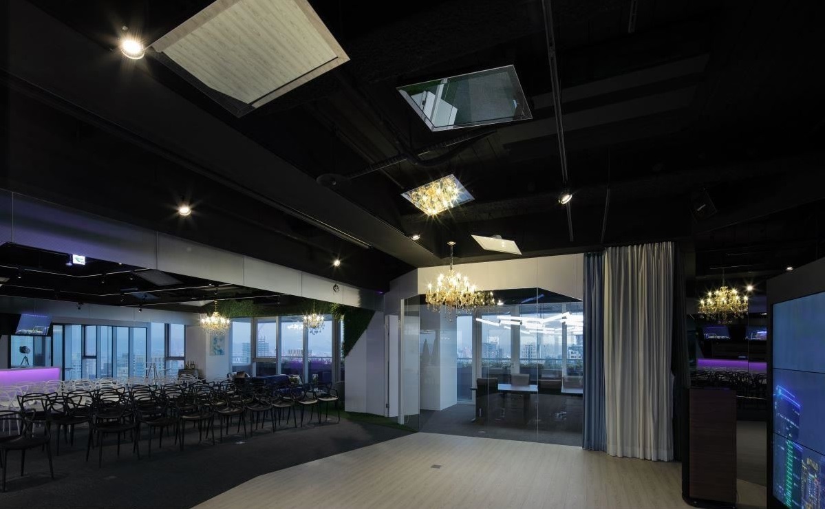 整個空間跳脫了格局的限制,設(shè)計師以大量不規(guī)則的線條語匯,包括多層次的線性光帶、噴黑的天頂結(jié)構(gòu)、管線等創(chuàng)造活潑視感,也達(dá)到視覺極致延伸的效果,連展演區(qū)座椅的采購,也選擇黑白雙色、并擁有鮮明線條造型、易于收納的款式,與現(xiàn)場的黑白灰階基調(diào)相呼應(yīng)。但除了沈穩(wěn)兼具個性的中性灰階之外,也不忘融入塊體、幾何元素的穿針引線,醞釀全區(qū)源源不絕的動態(tài)活力,像是一旁休憩區(qū)鋪設(shè)的人工草皮、用于重點端景立面的植生墻綠意、以及和整體現(xiàn)代簡約風(fēng)格強烈對比的古典水晶燈等等,都為空間感官帶來豐富的藝術(shù)養(yǎng)分!