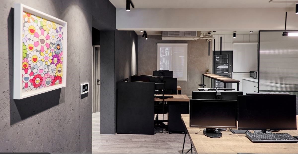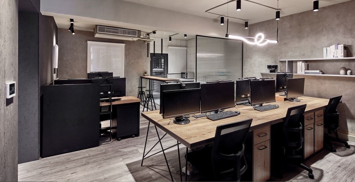 跳脫商業(yè)空間的思維,以個(gè)性工業(yè)風(fēng)作為基底,辦公桌以木桌搭黑鐵腳設(shè)計(jì),系統(tǒng)板材打造個(gè)人抽屜柜;開放式的桌面像是咖啡廳里面的大長(zhǎng)桌,可以專注工作也方便與同事相互討論交流。茶水間植入高腳吧臺(tái)座位,半透明的長(zhǎng)虹玻璃隔屏帶給休憩區(qū)隱私,同時(shí)又不會(huì)生硬地切割空間;冰冷的天花板照明改成軌道燈,偏暖的色溫搭配可以調(diào)整照明角度的設(shè)計(jì),會(huì)讓空間多幾分溫暖,同時(shí)也能打在墻面創(chuàng)造光影的變化趣味。廊道上與空間轉(zhuǎn)角擺放著色彩繽紛的藝術(shù)掛畫以及公仔玩偶,每個(gè)轉(zhuǎn)角都帶著驚喜,也能激發(fā)活力與創(chuàng)意;而戶外陽(yáng)臺(tái)擺放張椅凳搭配大型落地植物,創(chuàng)造一個(gè)自然充電的角落。