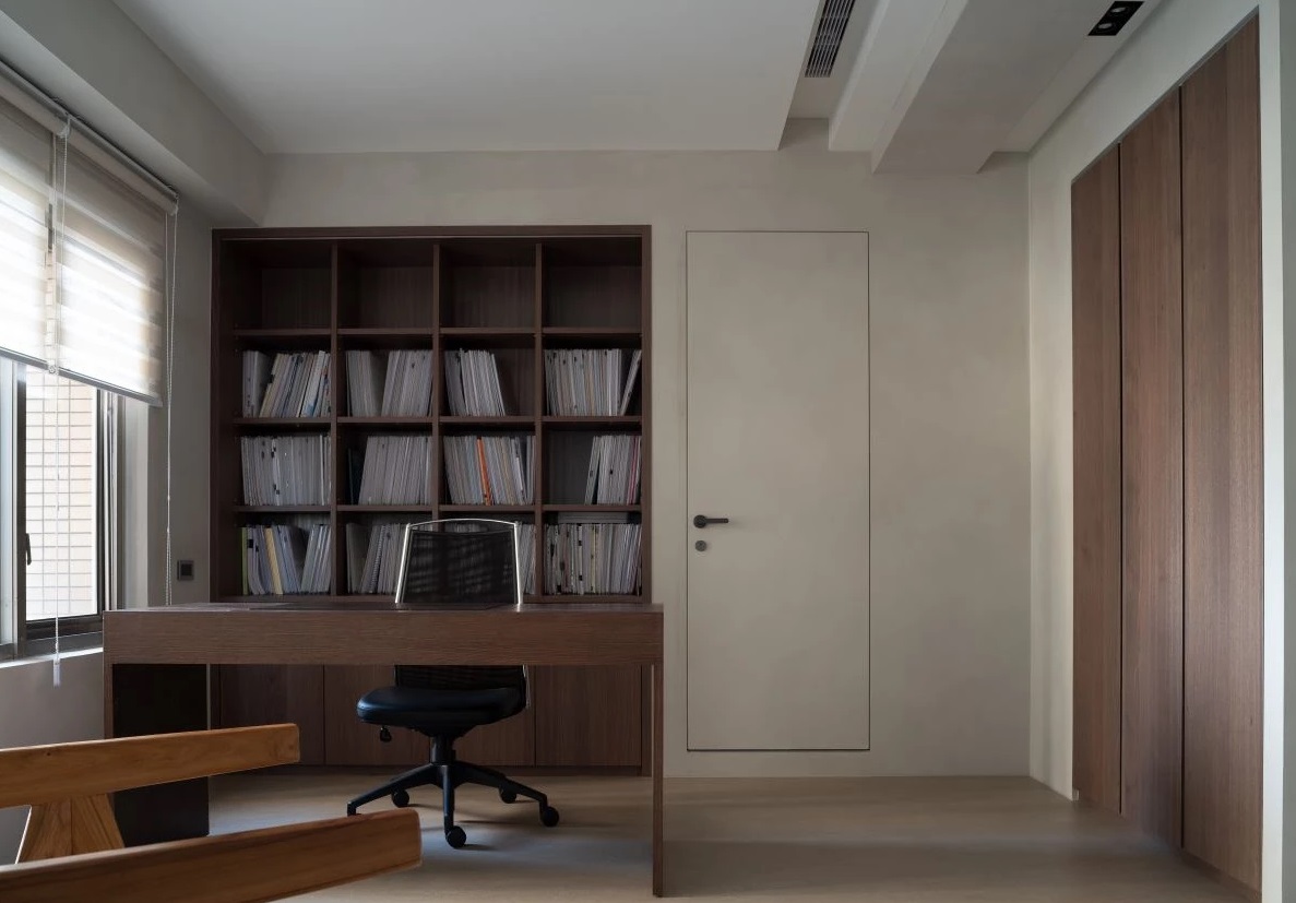 會(huì)議室以特制的玻璃書(shū)柜做為隔屏,打上洗練的光帶,讓書(shū)柜成為整個(gè)空間中最迷人的裝置藝術(shù),達(dá)到透光不透影的目的,也借此達(dá)到分享光源,化解空間陰暗的問(wèn)題。