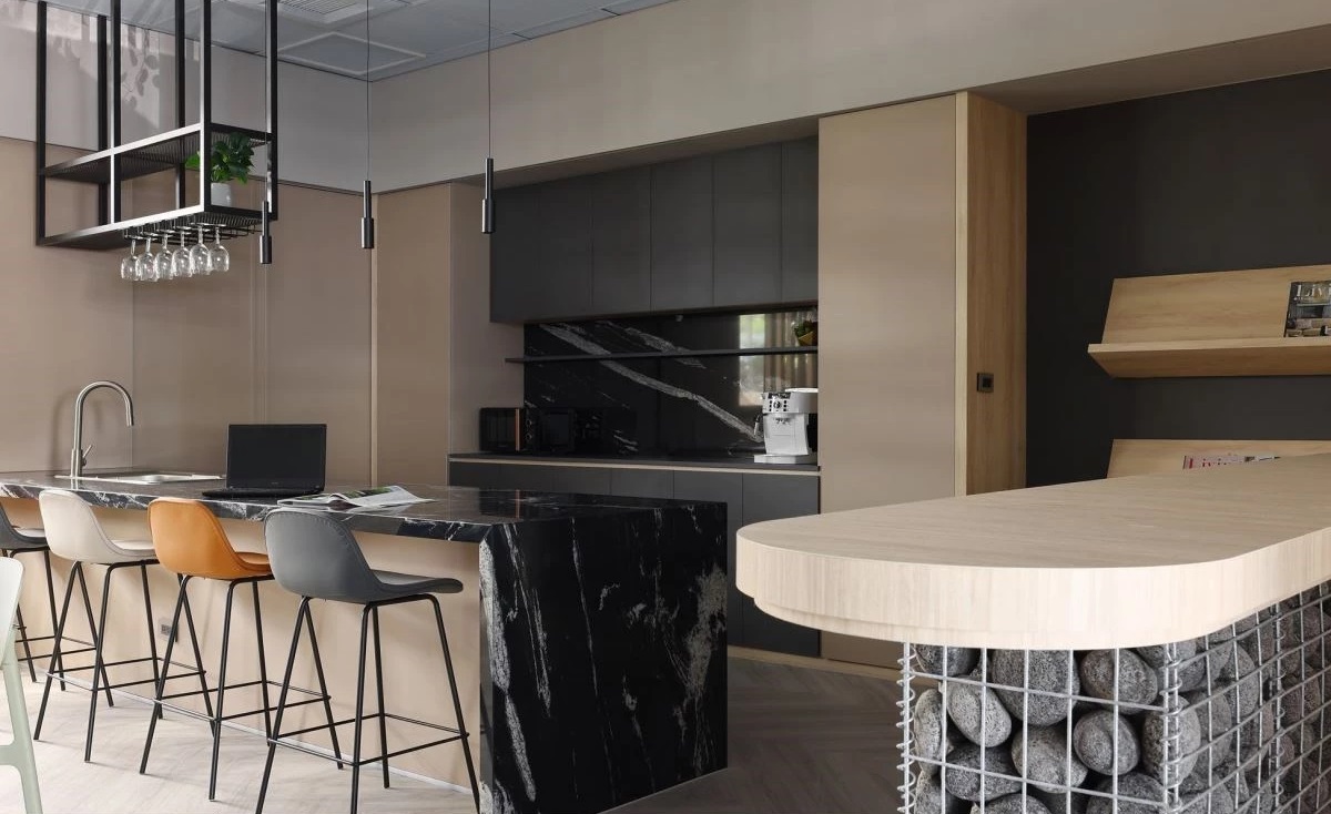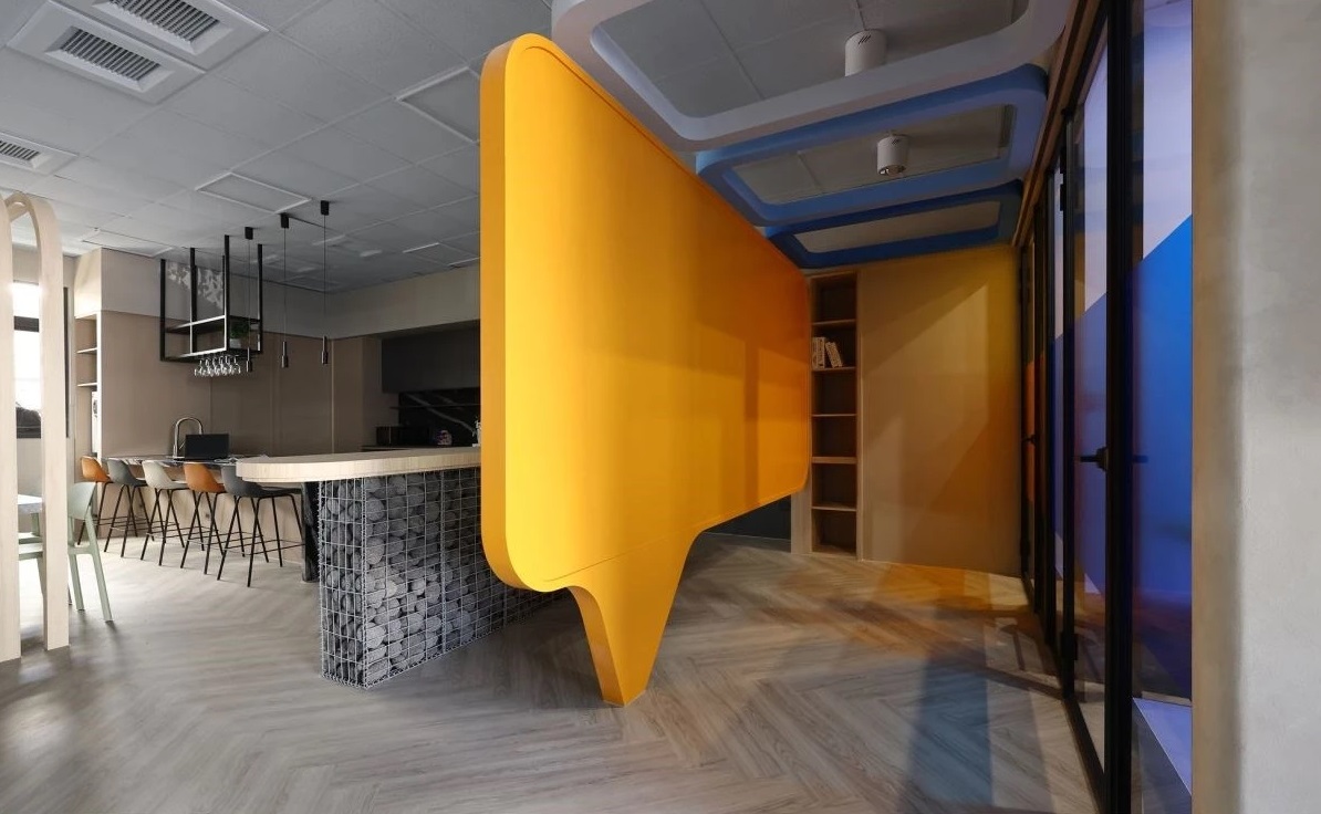 入口處坐落鮮明的亮橘對(duì)話框,給人耳目一新的朝氣活力,更強(qiáng)調(diào)人與人之間溝通的重要性,并在背面安排白板設(shè)計(jì),加上由石塊奠基而成的簡報(bào)臺(tái),順勢建立起小型的會(huì)議室。輕食吧臺(tái)區(qū),注入靜謐的深黑大理石,輔以俐落的鐵件吊架、收納柜,配置流理臺(tái)及烹飪小家電,讓員工能滿足午間的料理需求,平日也是彈性寫意的辦公區(qū),隨時(shí)切換截然不同的工作心情。
